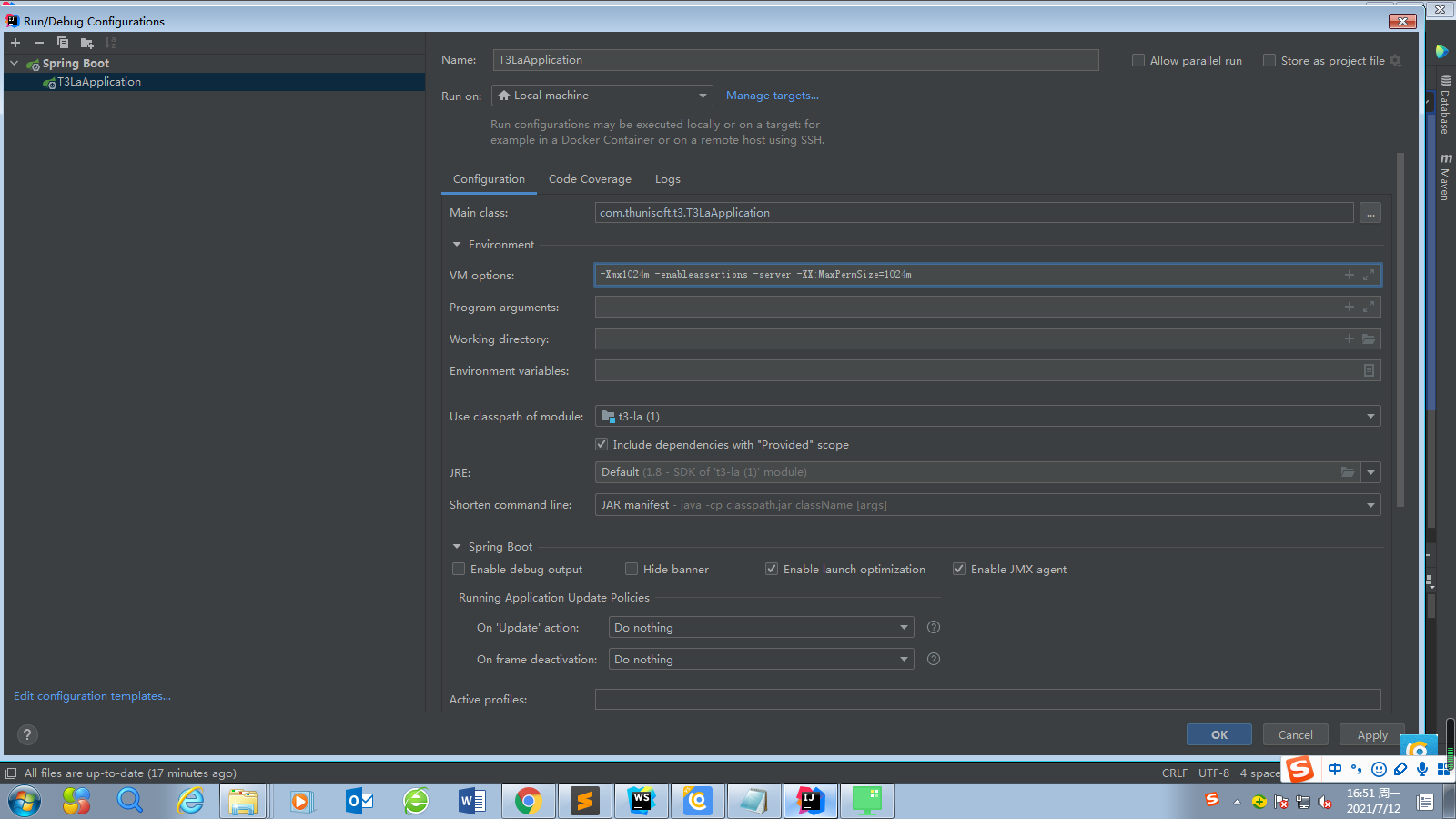 VM options:-Xmx1024m -enableassertions -server -XX:MaxPermSize=1024m?