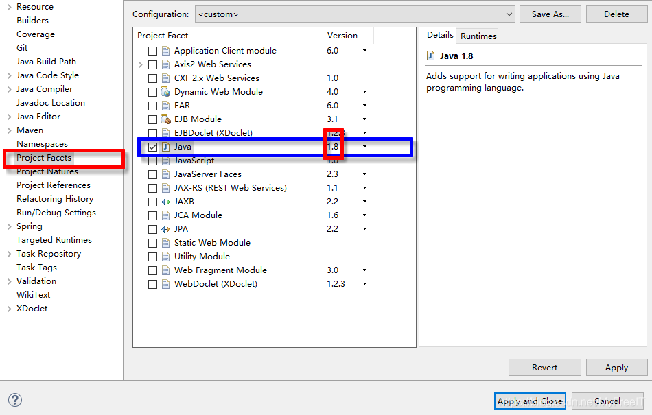 ?Project 右键Properties,修改project facets 工程支持的领域,并选择对应的版本号。