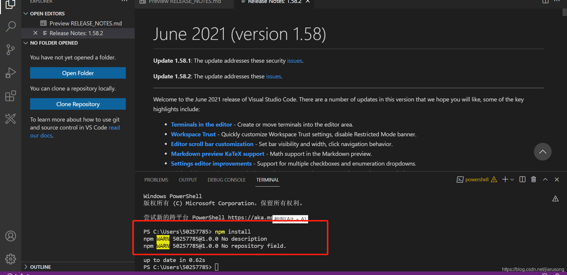 都按百度经验搞完之后,现在再重启VScode,键盘输入ctrl+shift+`,打开terminal ,输入npm install
