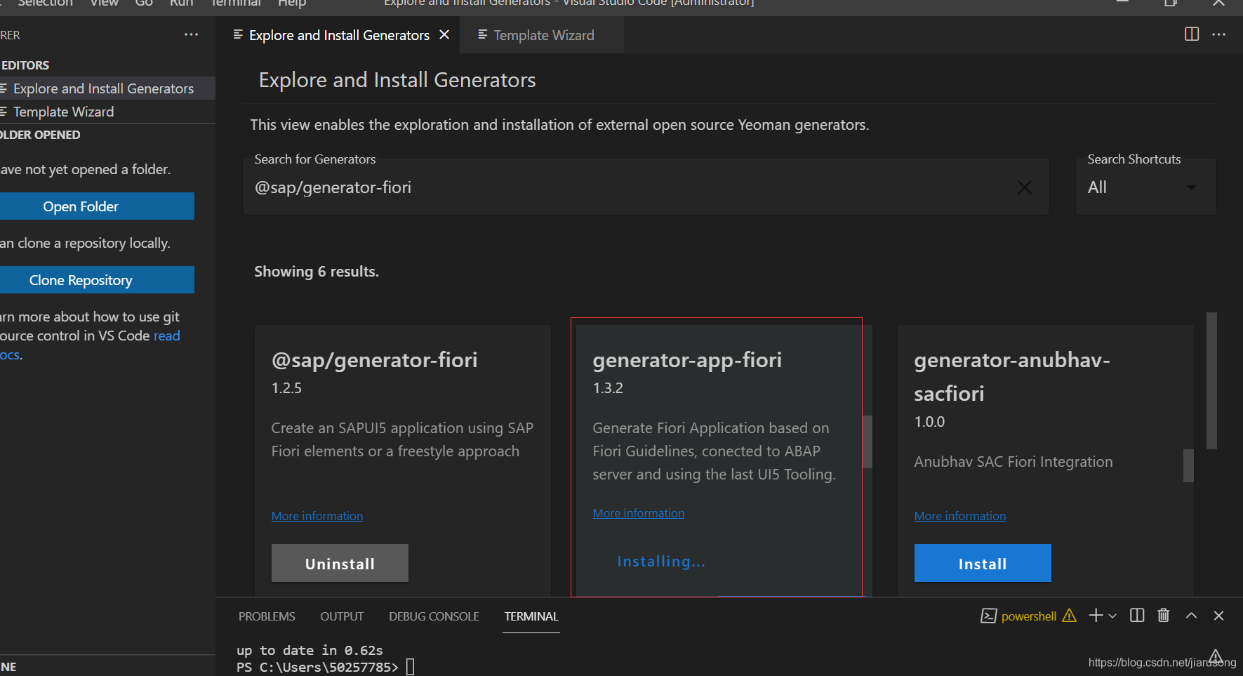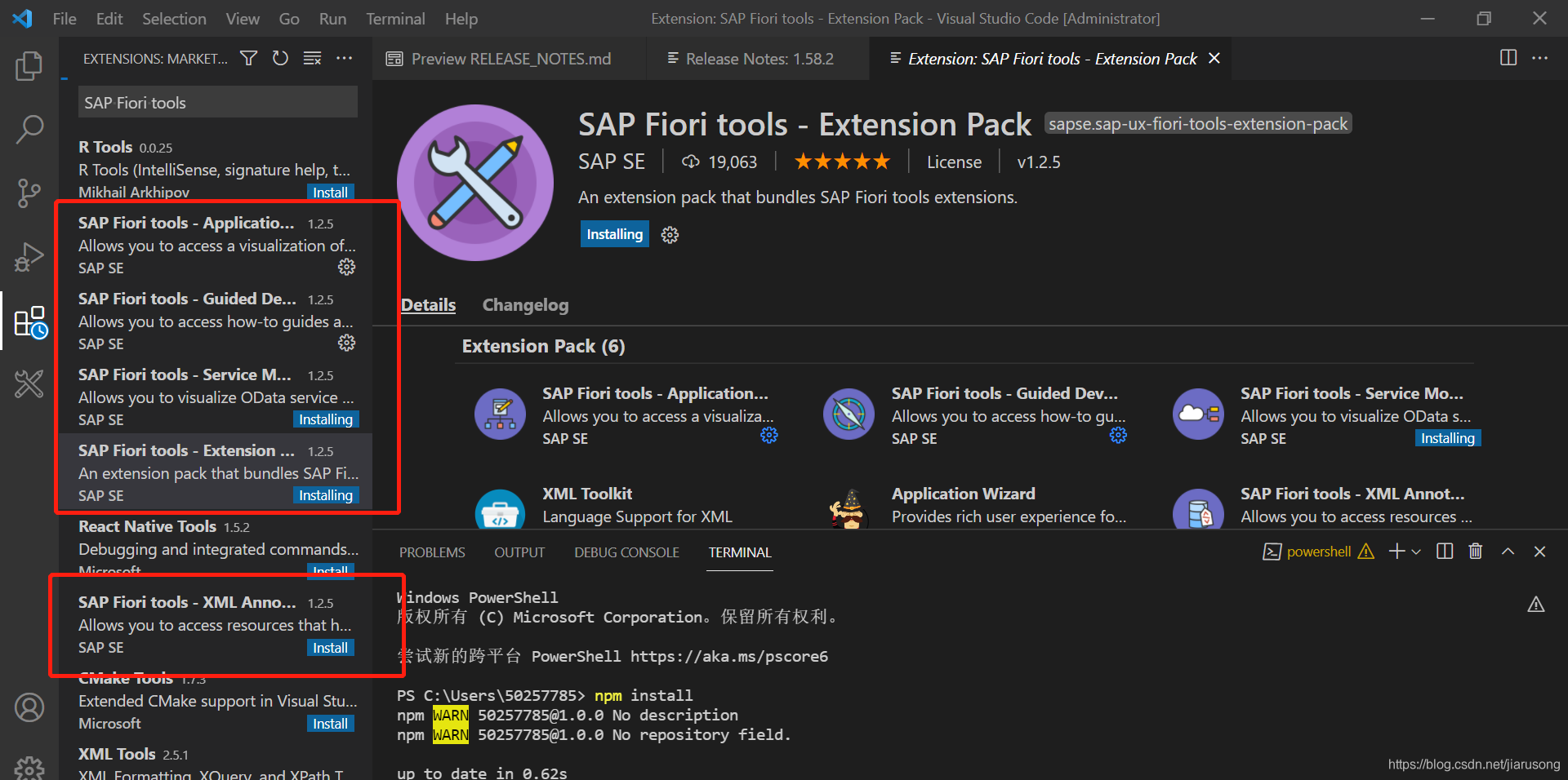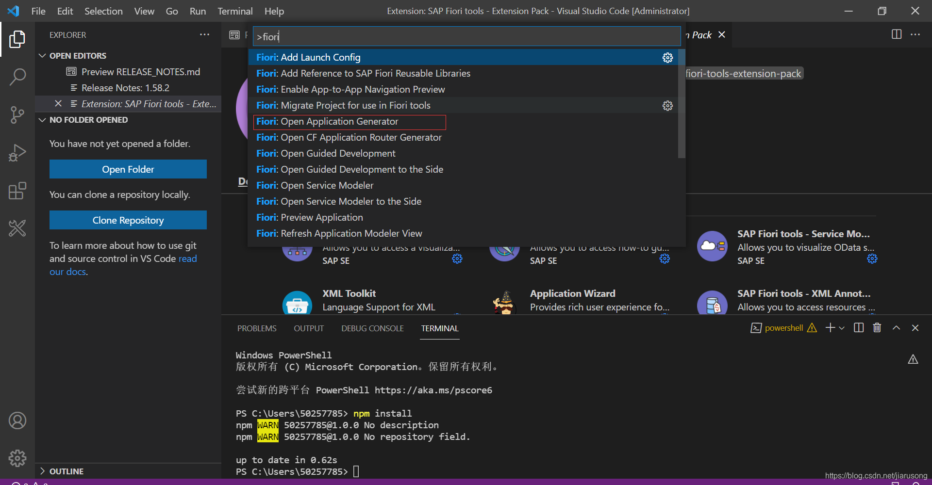 在左侧菜单栏这个地方是extension,就是装插件的。在上方搜索框输入SAP Fiori tools 后,把出来的这几个全部都点一下安装,这里就先装这么多,插件是好心人不断更新的,如果有需要可以不定时来找下新插件。