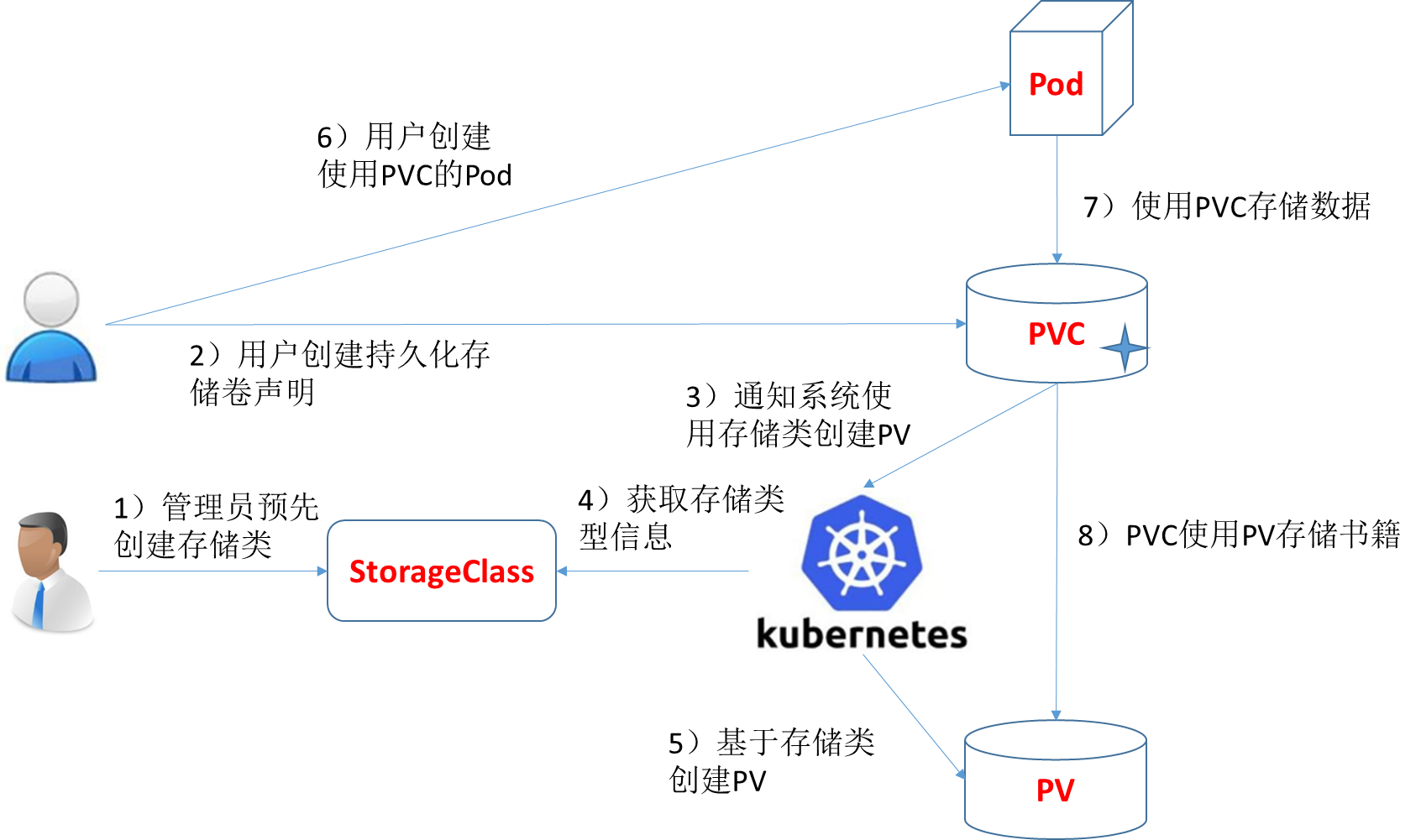 StorageClass 为管理员提供了描述存储 "类" 的方法。 不同的类型可能会映射到不同的服务质量等级或备份策略,或是由集群管理员制定的任意策略,这一句话有点难以理解,通俗的说,storageClass提供了一个创建PV的模板,在storageClass的这个模板中,可以指定PV的创建策略(动态or静态?),大小,读写策略,绑定策略等等,有了这些信息,Kubernetes就能够根据用户提交的PVC,找到对应的StorageClass,然后Kubernetes就会调用 StorageClass声明的存储插件,创建出需要的PV。