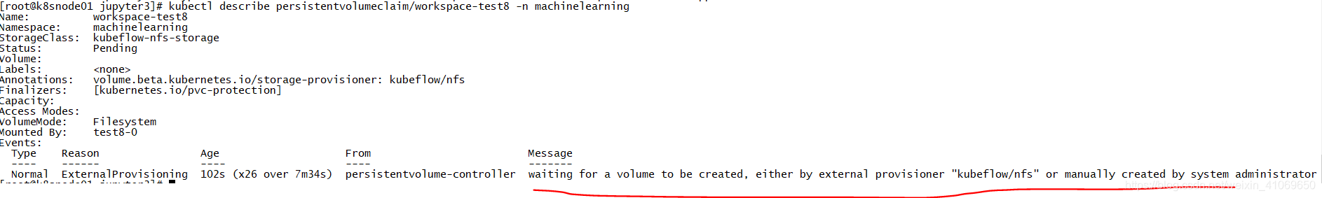 没有创建成功,在后台我们describe test8的pod,提示为:?pod has unbound immediate PersistentVolumeClaims,再describe这个pvc,提示为:
