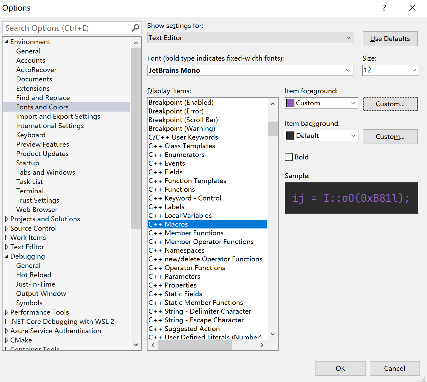 6. 在 Fonts and Colors 里为字体选择 JetBrains Mono。有些字样会过于亮,比如 C++ Macros。可以在下面的对话框里选择,然后点击Custom,将饱和度调整到100或以下。