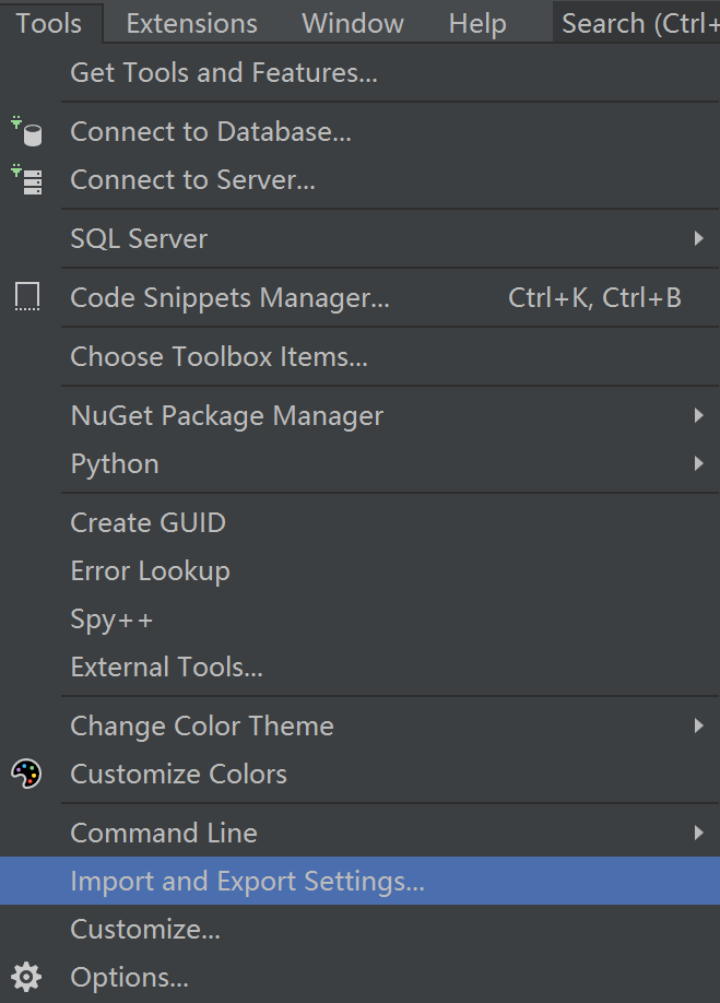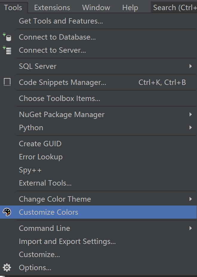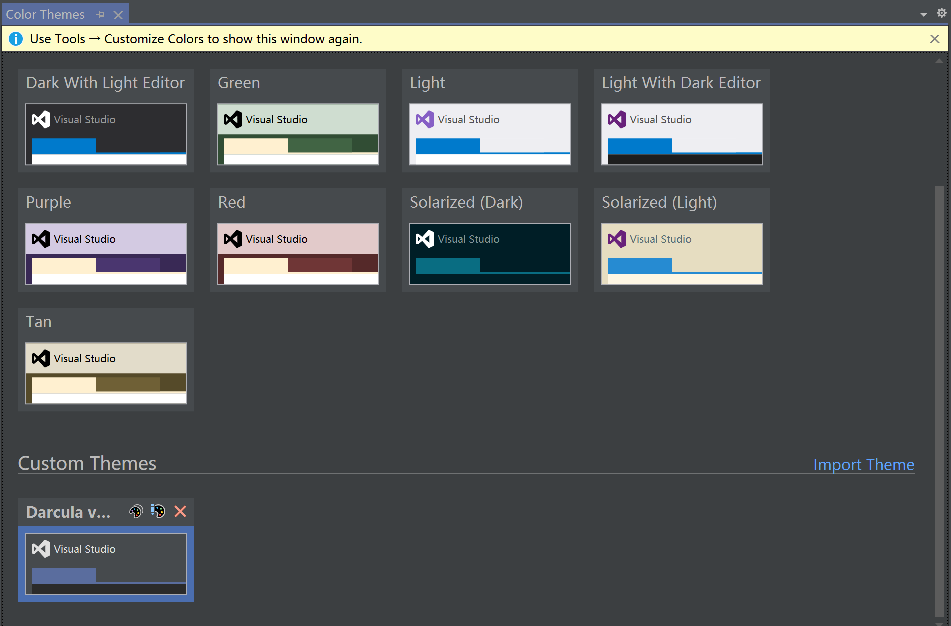 4.? 从 VS2019-Tools-Customize Colors 呼出?Color Theme Editor for VS2019, 然后在 Costom Themes 下面? Import Theme, 选择刚才下载的?darcula-vs-2019.vstheme?