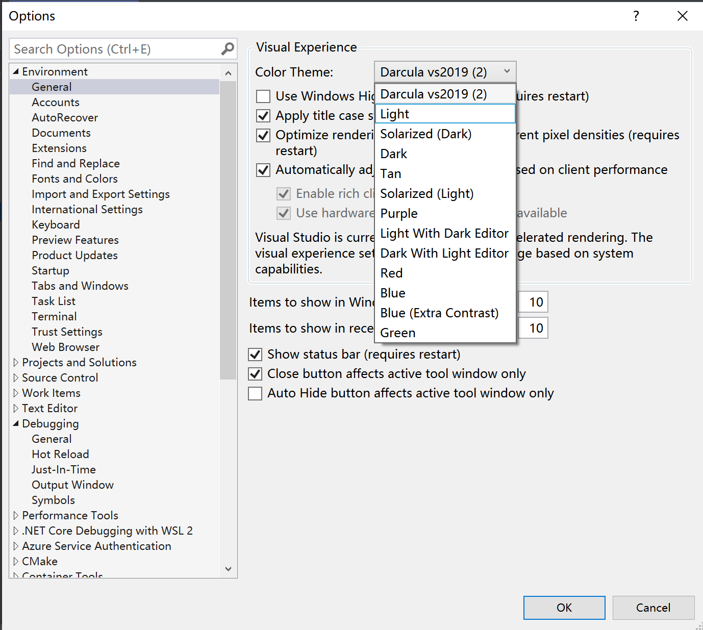5. 在VS2019里选择 Debug-Options-Environment-General,在 Color Themes 里选择刚才导入的 Darcula Theme