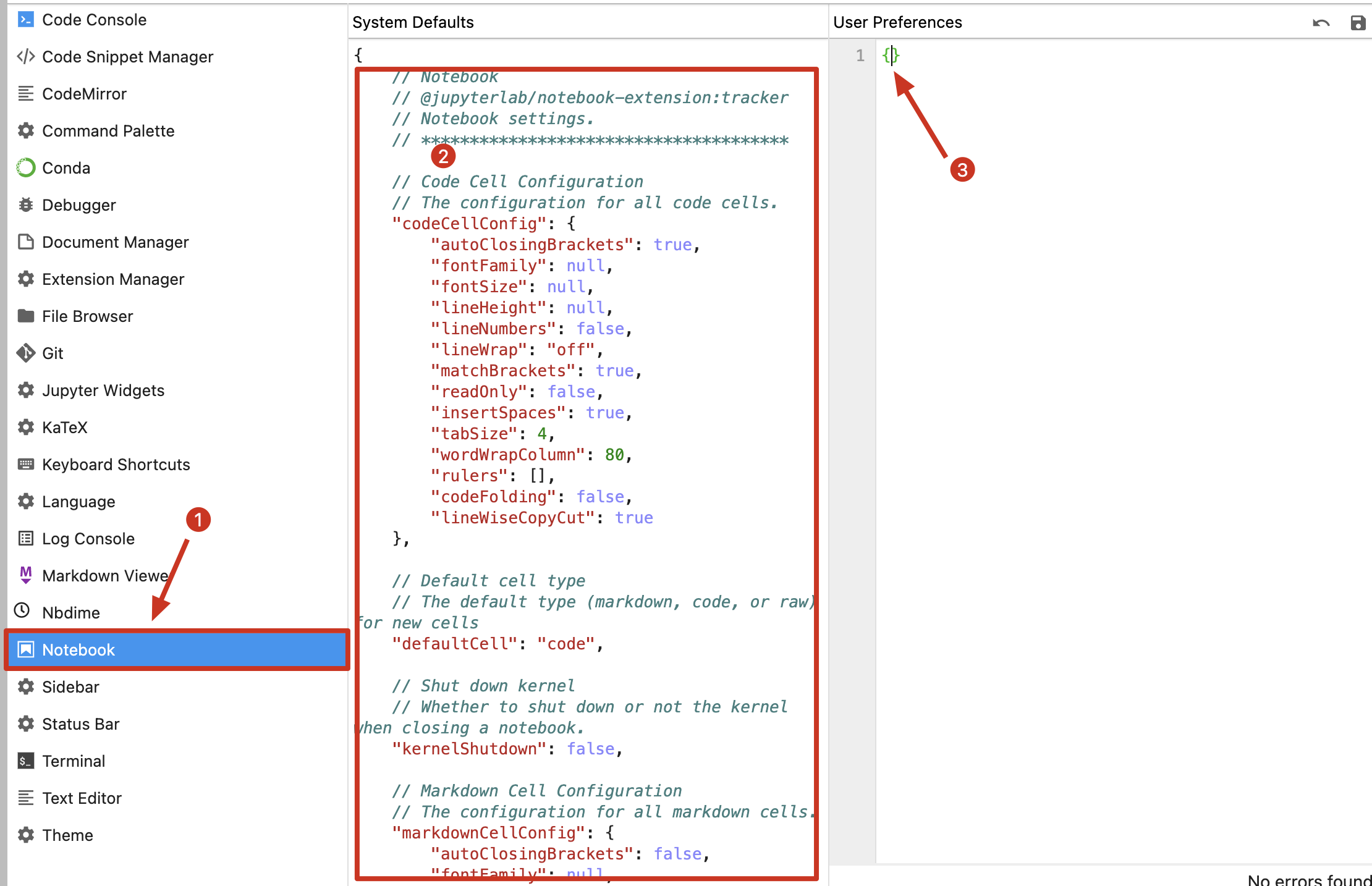 Notebook ,即下图中 ① 的位置 Notebook 的配置文件分为System Defaults 与User Preferences ,其运行逻辑与“须鼠管”类似,当System Defaults 与User Preferences 同时对某一项设置进行配置时,以User Preferences 为准- 因此可以将 ② 中,花括号中的内容全部复制到 ③ ,以实现通过