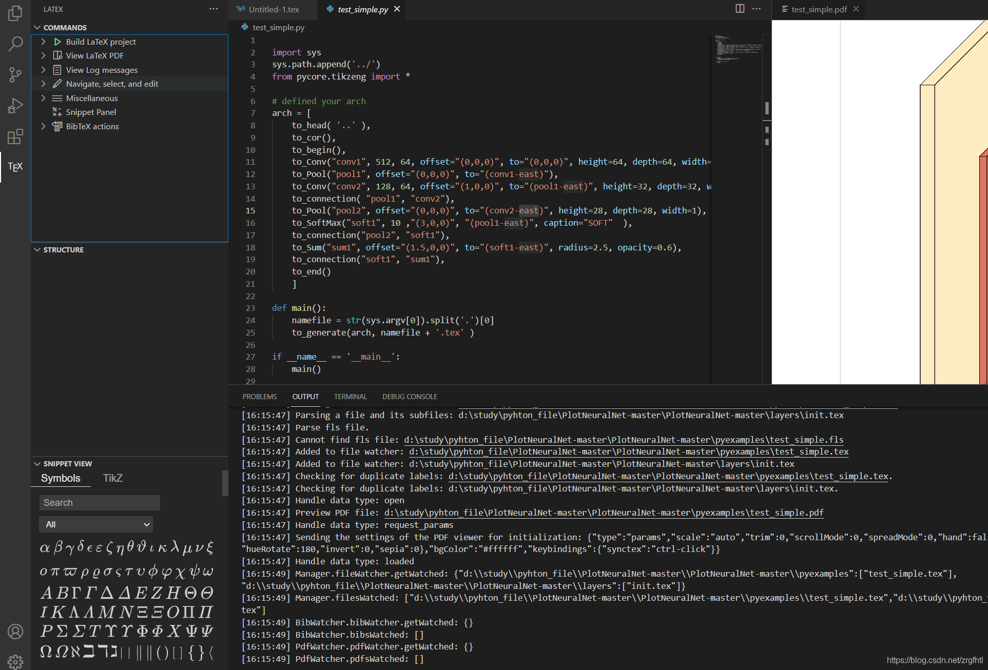在右侧会出现TEX字样,点击   把Build LatTex project,View LaTeX PDF 打开 可以看到编译工具(点击绿色三角即会编译),和PDF显示的选项。