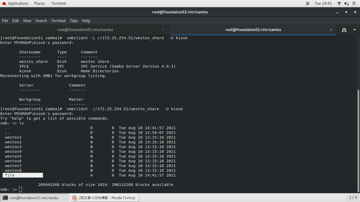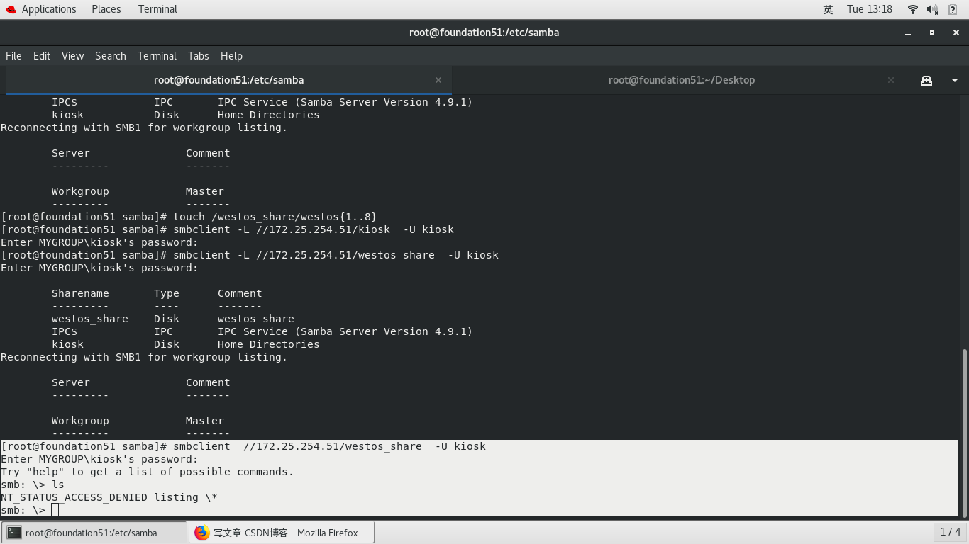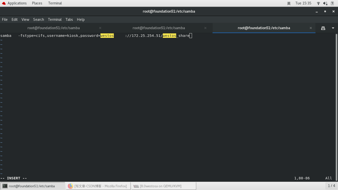 samba -fstype=cifs,username=kiosk,password=westos ://172.25.254.51/westos_share