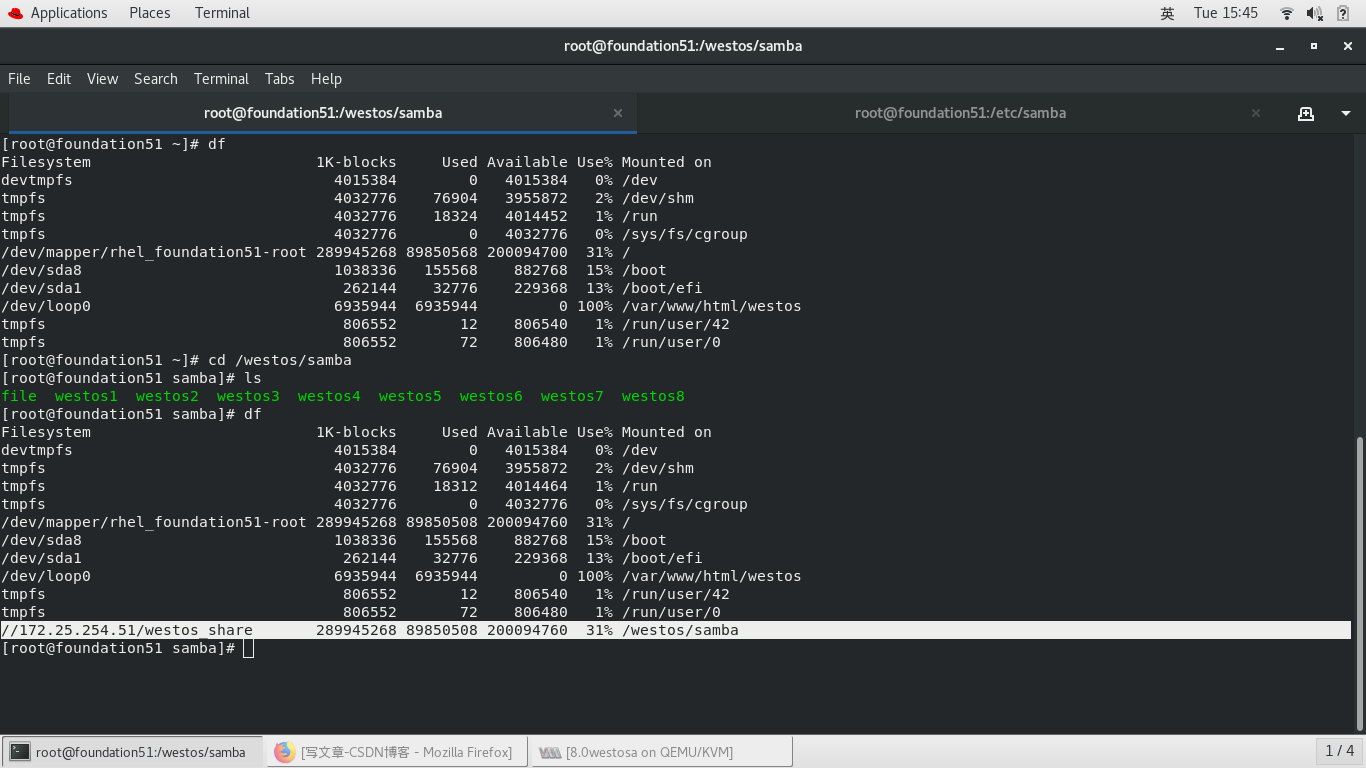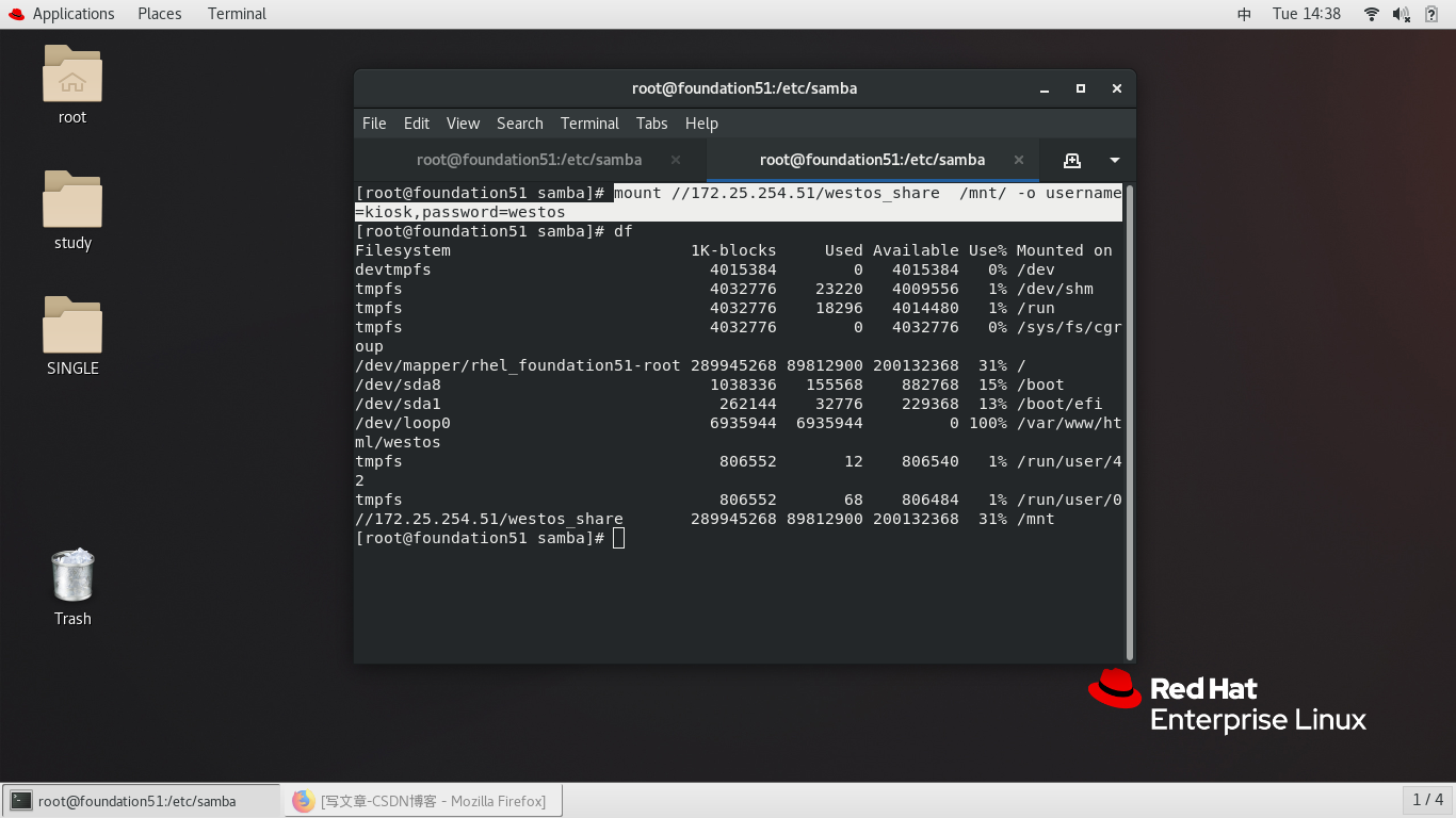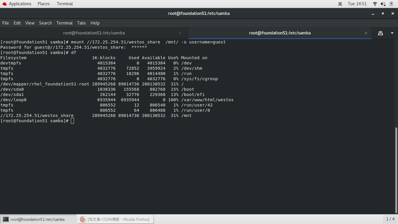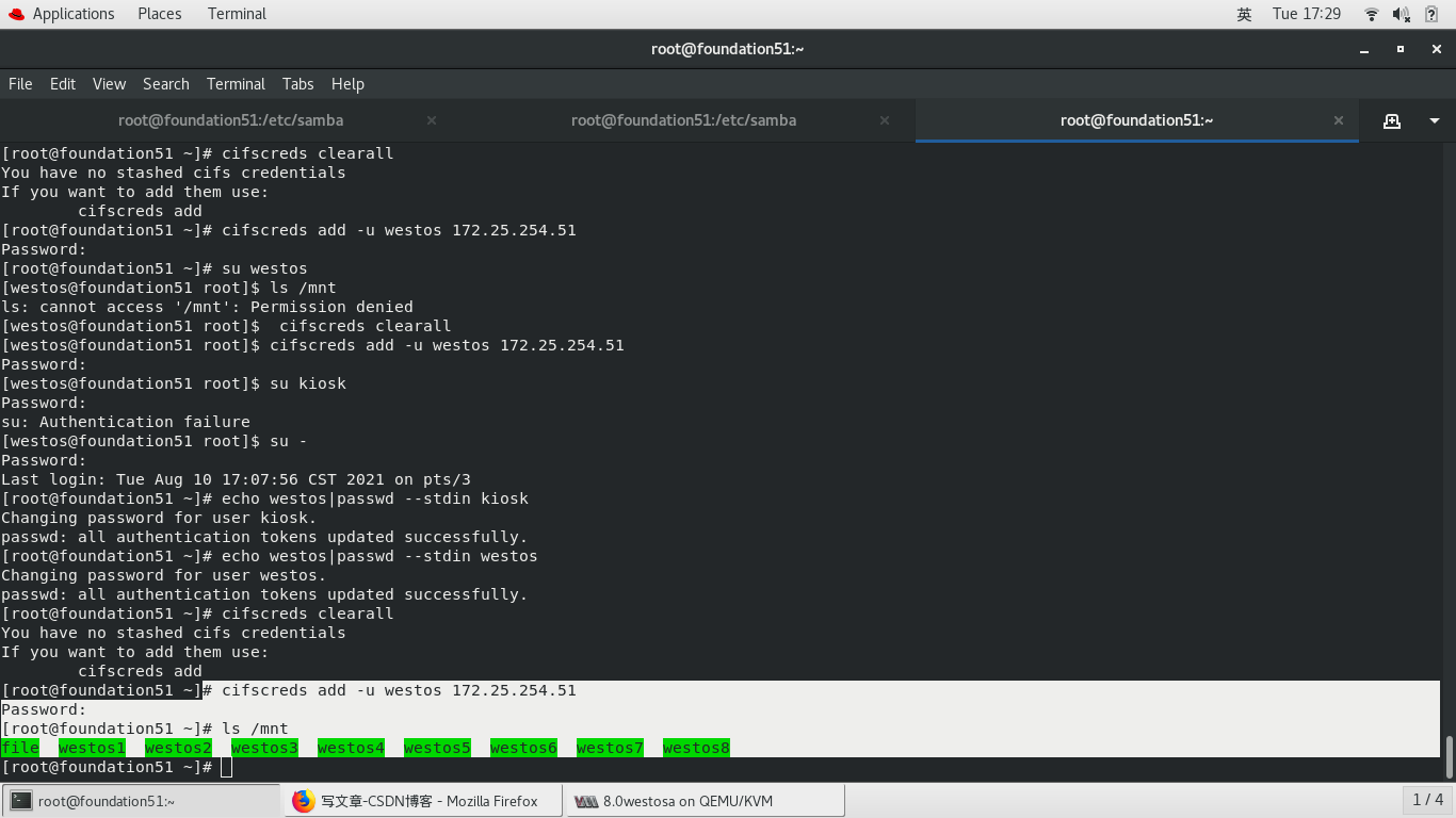mount //172.25.254.51/westos_share /mnt/ -o username=kiosk,password=westos 挂载