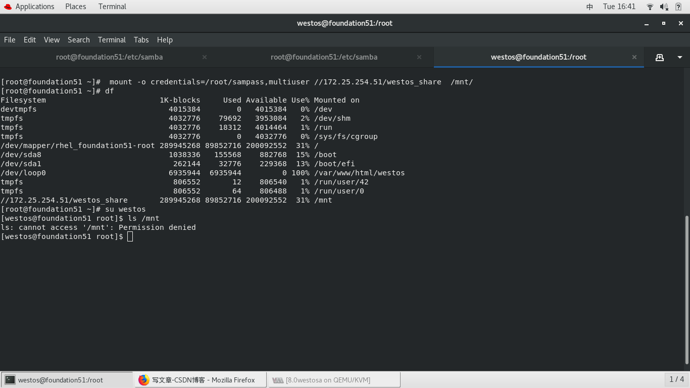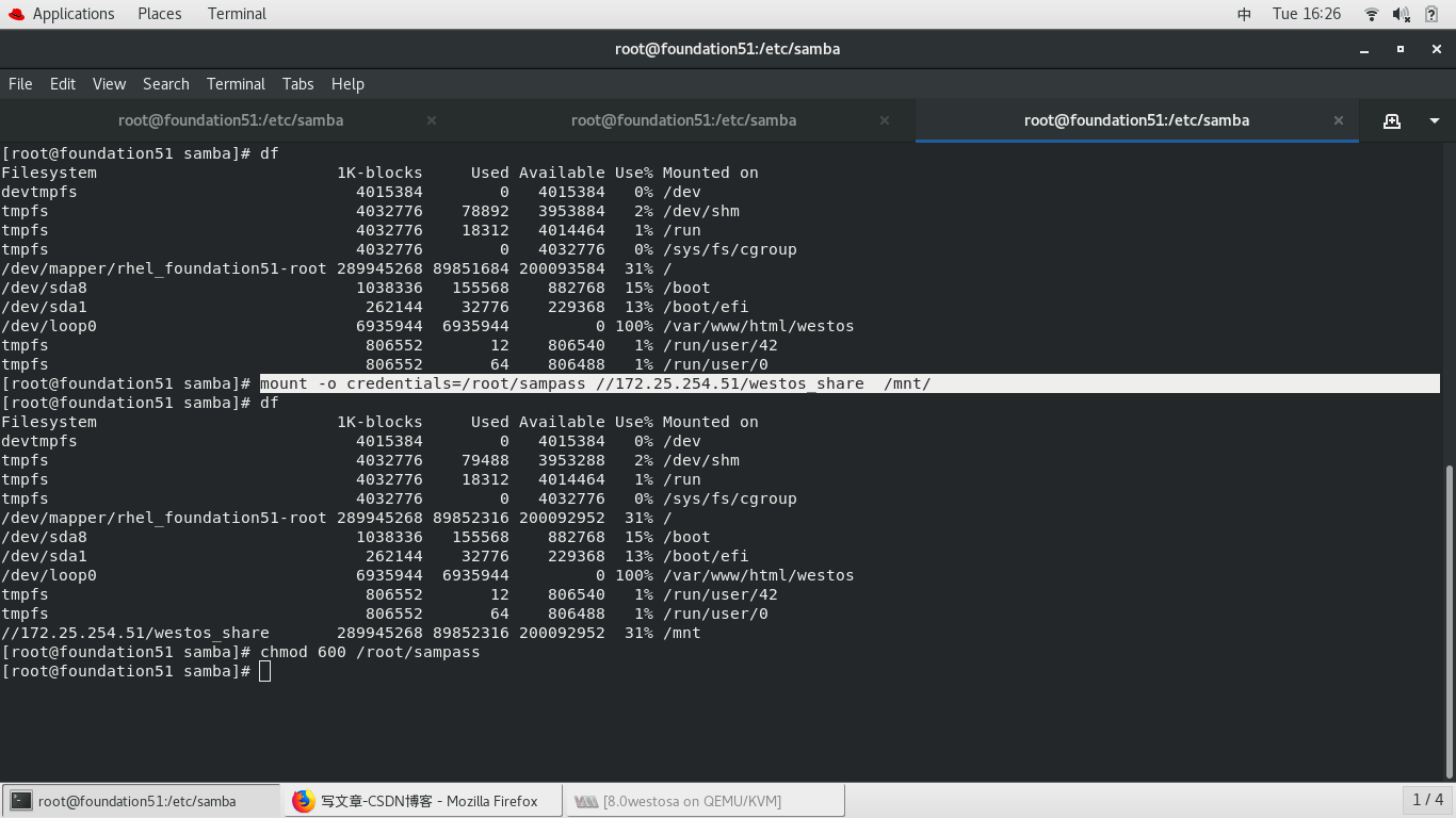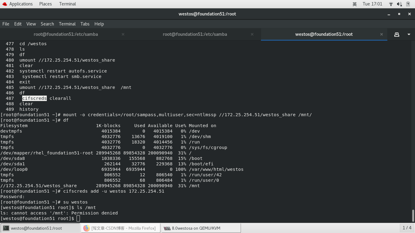 mount -o credentials=/root/sampass //172.25.254.51/westos_share /mnt/
