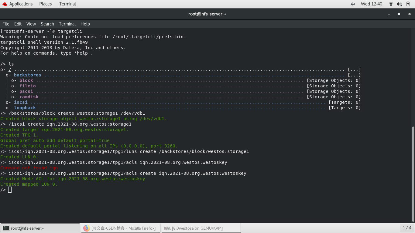 iscsi/iqn.2021-08.org.westos:storage1/tpg1/luns create /backstores/block/westos:storage1