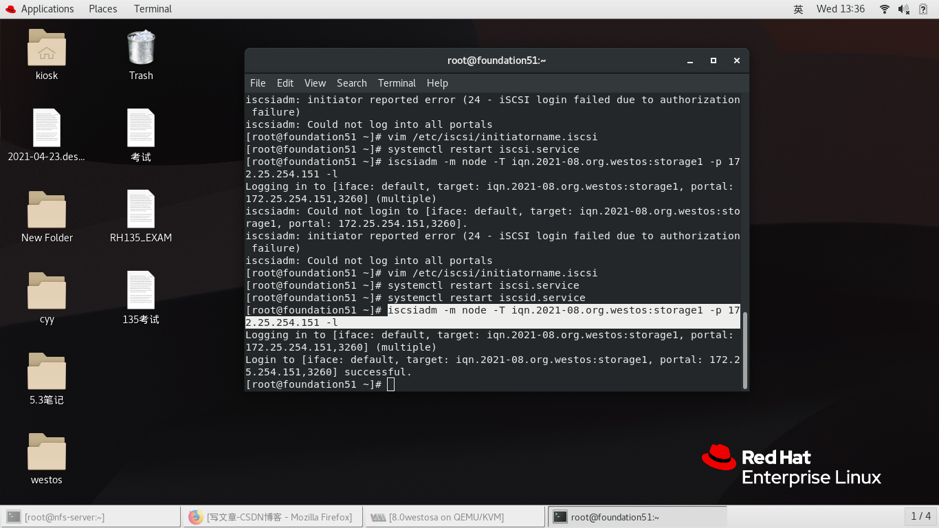 iscsiadm -m node -T iqn.2021-08.org.westos:storage1 -p 172.25.254.151 -l