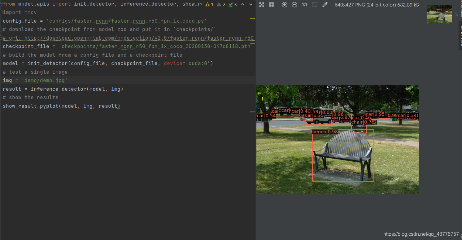 但是没有警告也没有弹出图片,然后又找到了它的官方的inference_demo.ipynb文件,跟着它用jupyter notebook走了一下,发现弹出图片效果了,然后查看代码如下: