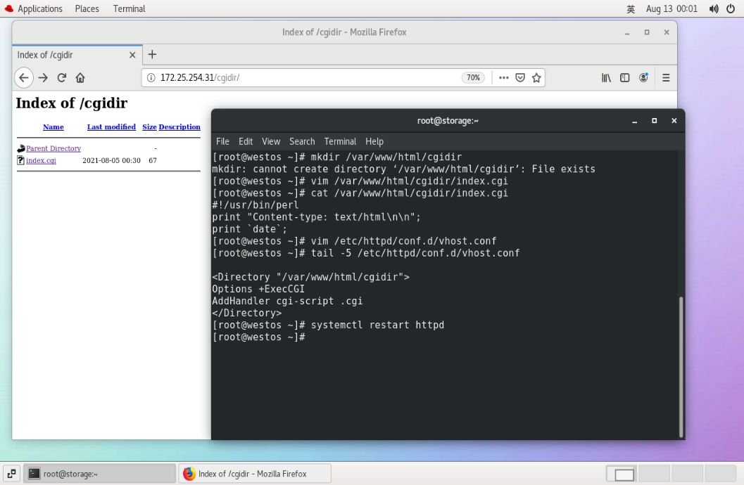 ?编写httpd服务的主配置文件,在文件最后添加对于/var/www/html/cgi目录,指定触发器识别该目录下以.cgi结尾的文件并执行CGI,接着重启httpd服务,给index.cgi文件赋予可执行权限 ? #wsgi#