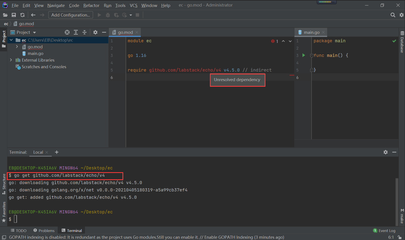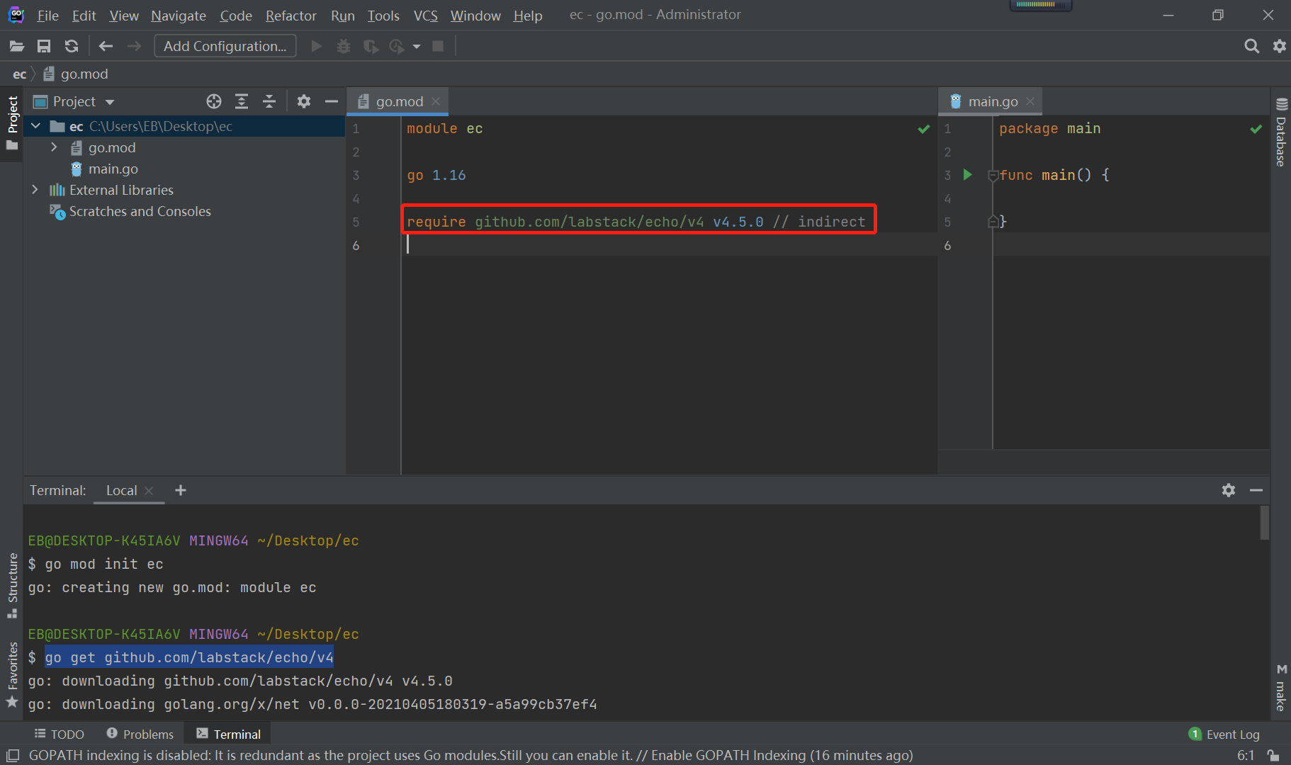 go get github.com/labstack/echo/v4,打开go.mod文件: