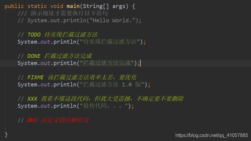 如下图所示,在IDEA中可以看出,除TODO 和 FIXME 有自带的样式外,其他均没有演示。