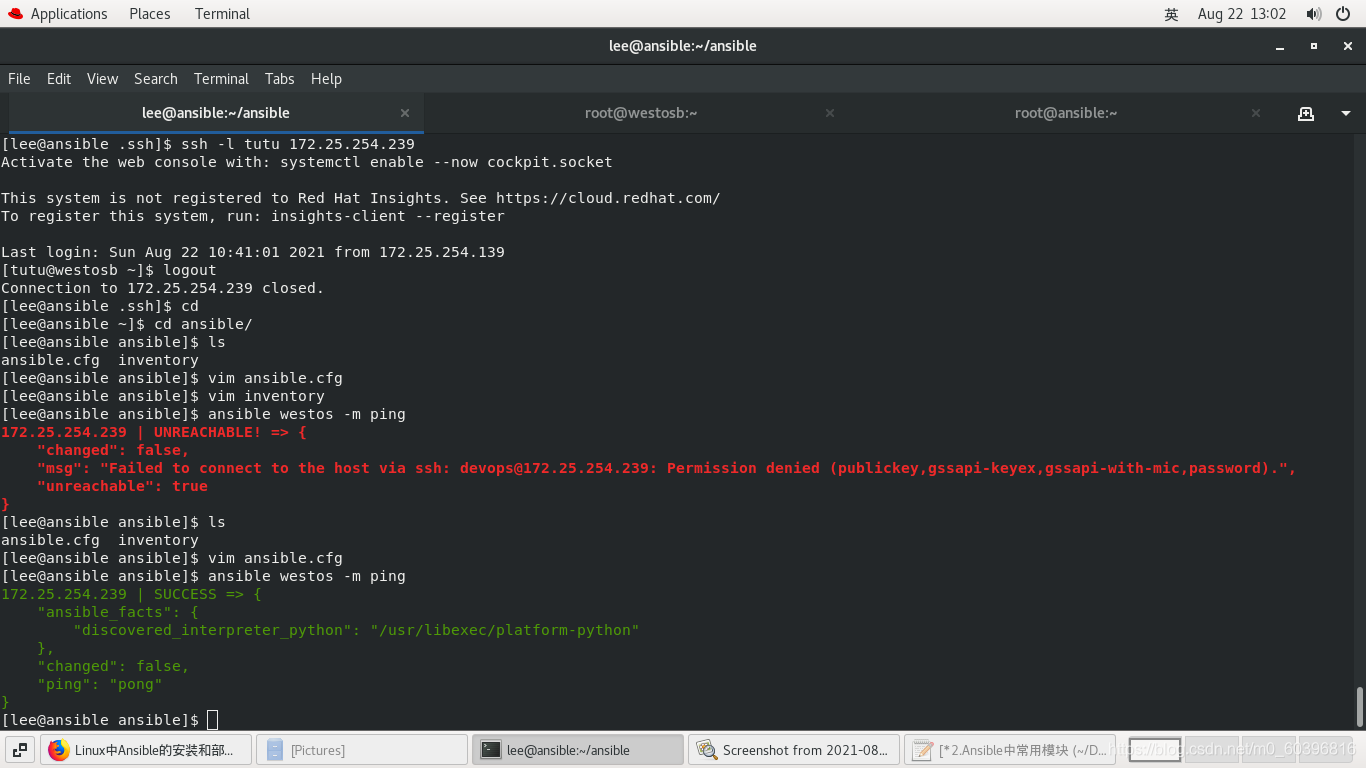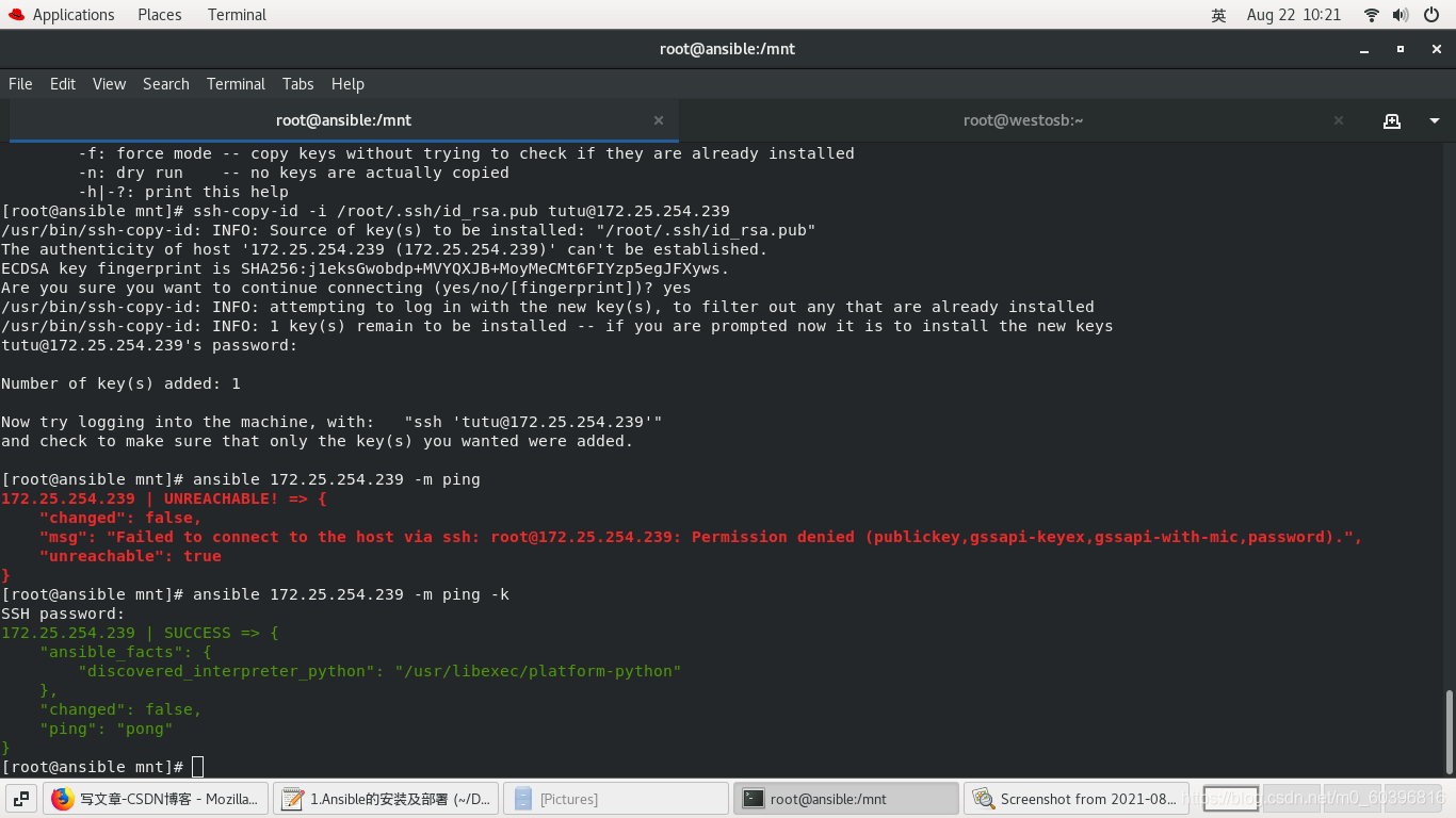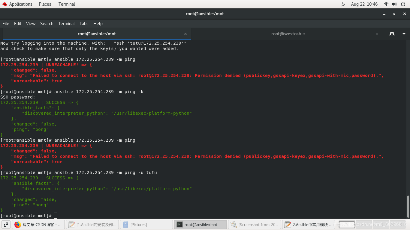 #ansible主机: ssh-keygen ssh-copy-id -i /root/.ssh/id_rsa.pub tutu@172.25.254.239 ansible 172.25.254.239 -m ping -k 控制239