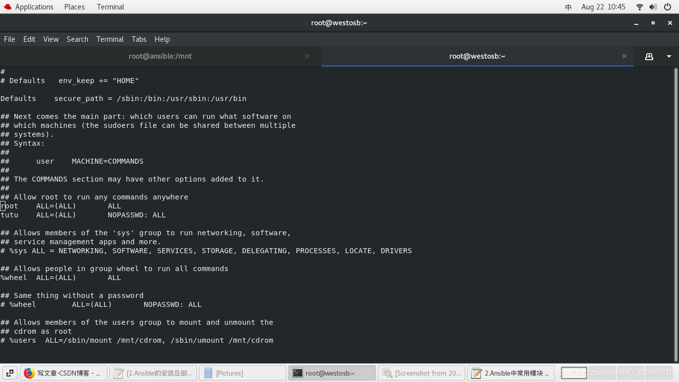 useradd tutu echo westos | passwd --stdin tutu visudo(权力下放) 100行 ? tutu? ALL=(ALL)?????? NOPASSWD: ALL