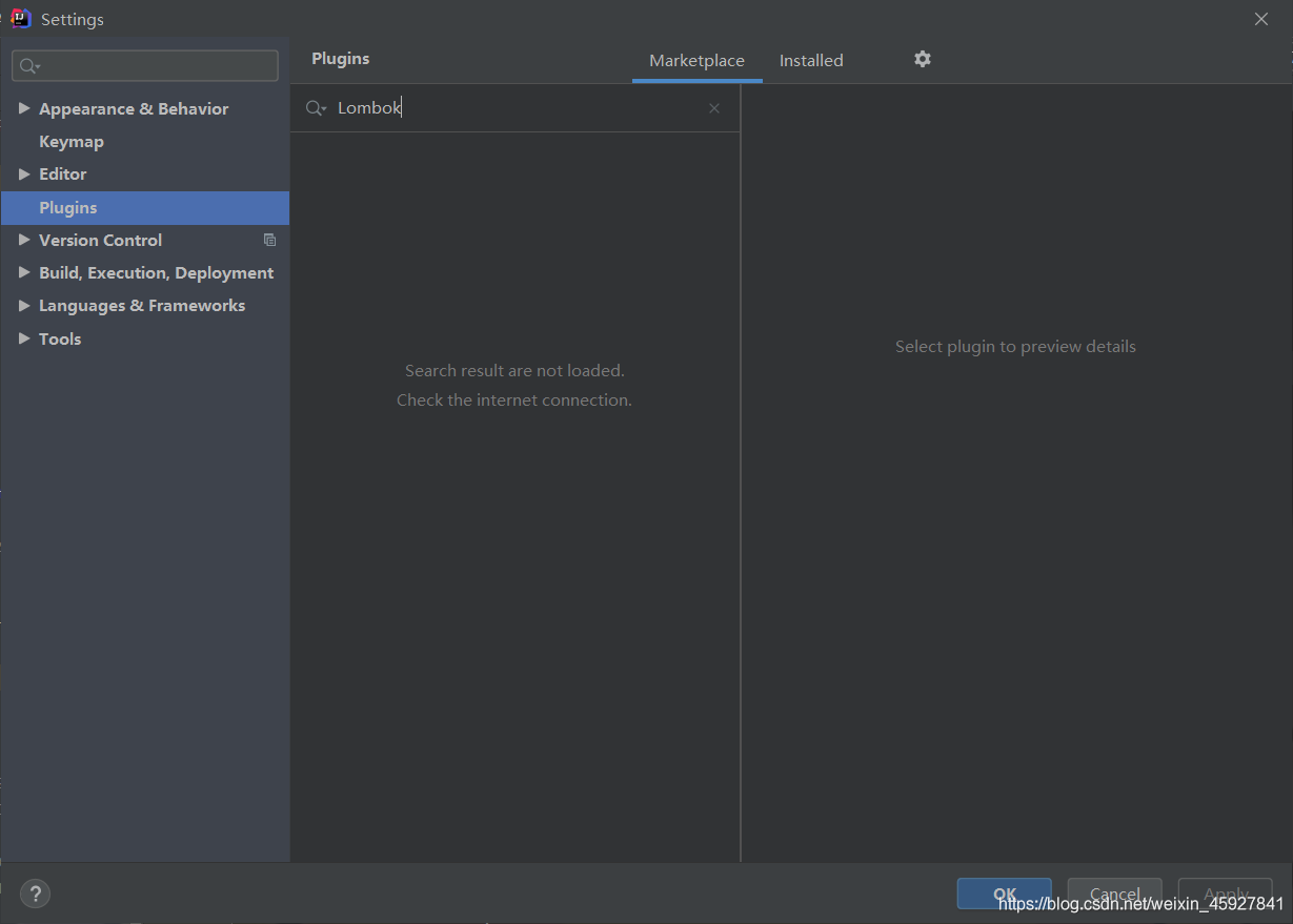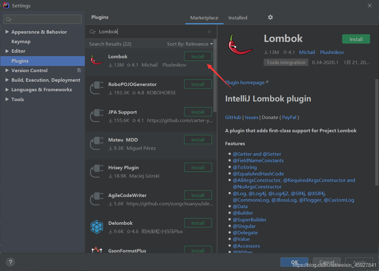 2.点击Plugins,搜索lombok(注:有可能在这一步里,你搜索不出来插件,可以看最下面注意事项进行解决)