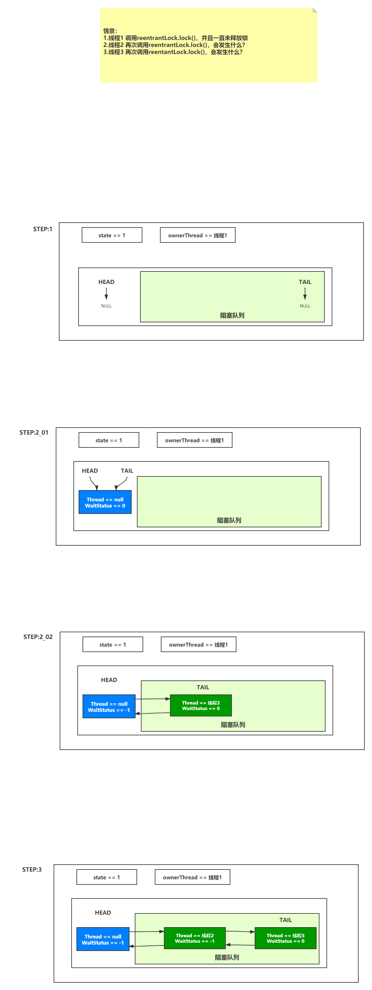 这时,没有生成队列的head节点。第二个线程来的时候,在AQS.enq()方法中会为第一个线程补上一个Node节点作为head。而这个Node对象是空的构造方法。