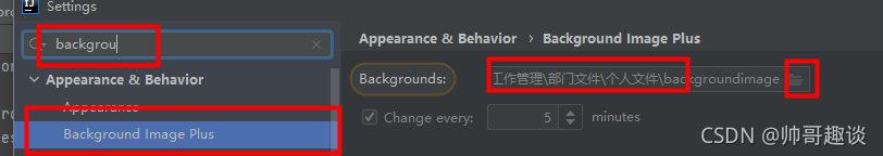 - 再次打开Setting设置,搜索background image plus,点击文件夹样式的按钮图片,设置图片的文件路径,设置为第一步的文件路径;change every是设置更换频率,如果有多张照片的时候可以自动切换,单位是分钟。