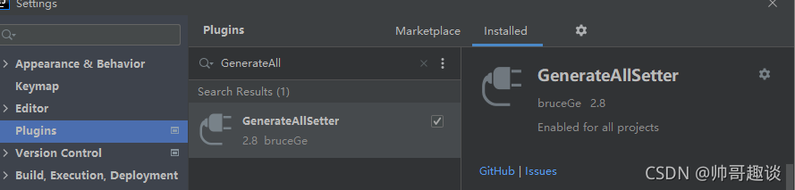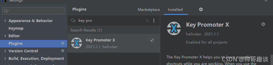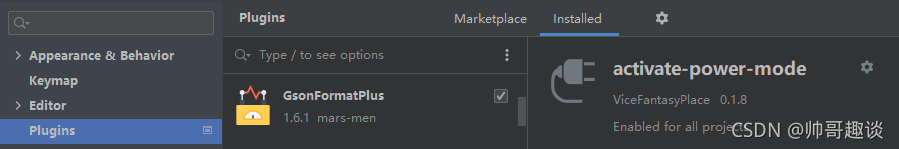 - 打开idea的Setting设置,快捷键Ctrl+Alt+s,选择plugin,然后选中MarketPlace(插件商店),installed(已安装的)。