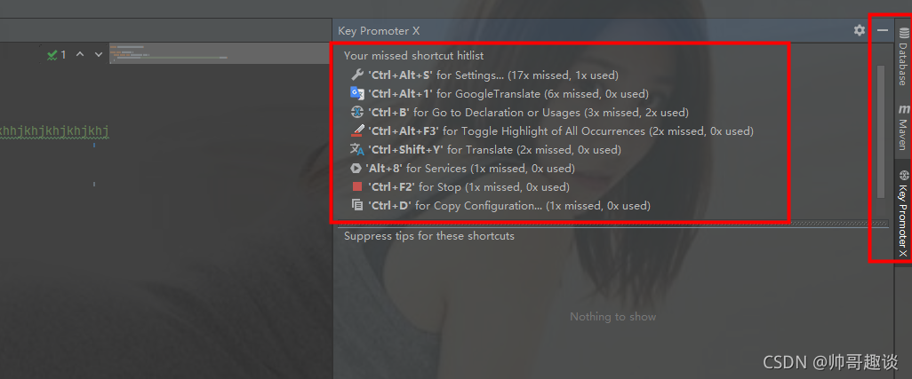 - 安装完成后的效果,会在右侧工具栏看到key promoter的按钮,它会记录我们的操作,同时指出这些操作对应哪些快捷键,是不是很智能,以后想忘记快捷键都难。