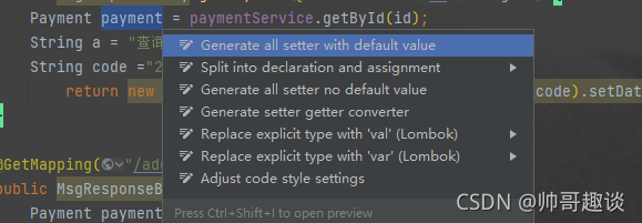 - 使用说明,快捷键Alt+Enter打开GenerateAllSetter的操作视图,选择相应的方法即可。