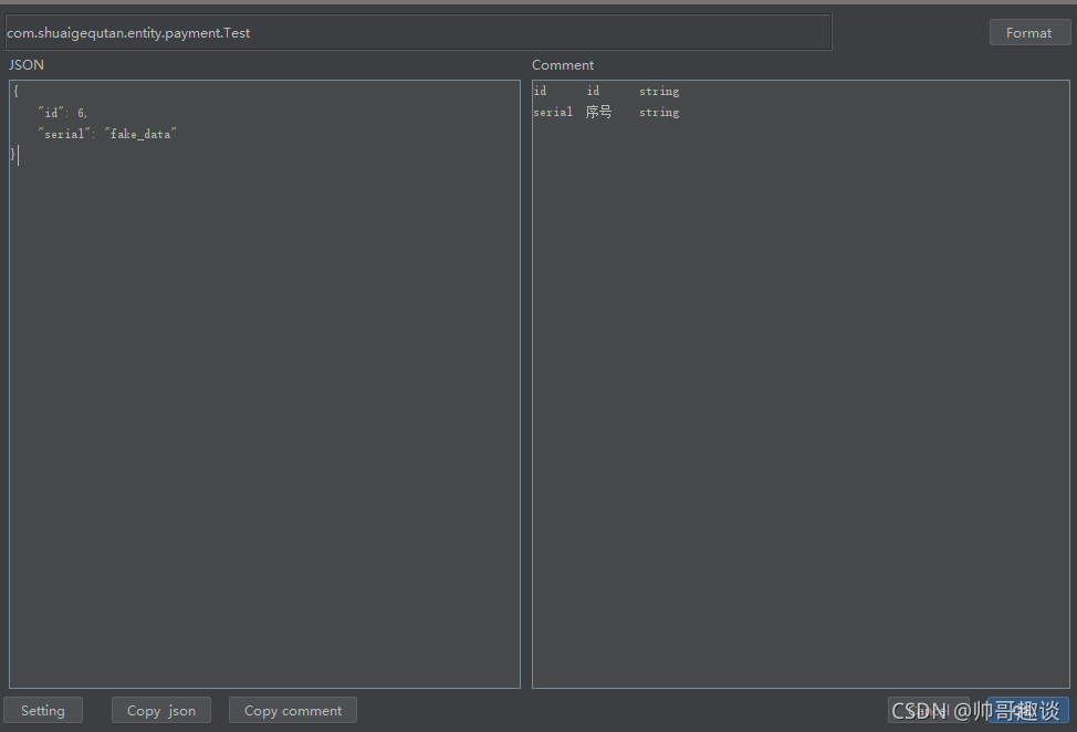 - 左边是json,右边是json中的注释,点击format,插件会自动把原json中的注释部分抓取过来。id的类型按String处理了,不是百分百准确,不要太较真