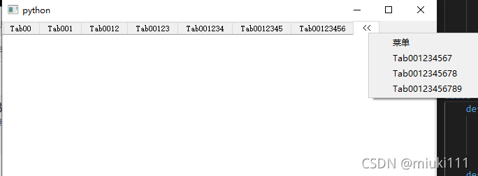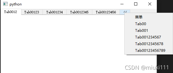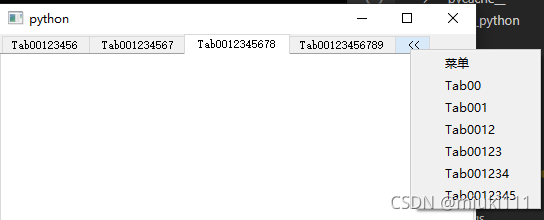 ? ? ? ? 被点击的tab为Tab0012,故将其添加回标签栏,并将Tab00234567隐藏于tabMenu中,并且拉伸窗口后其顺序不变.