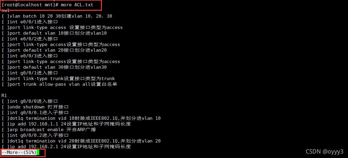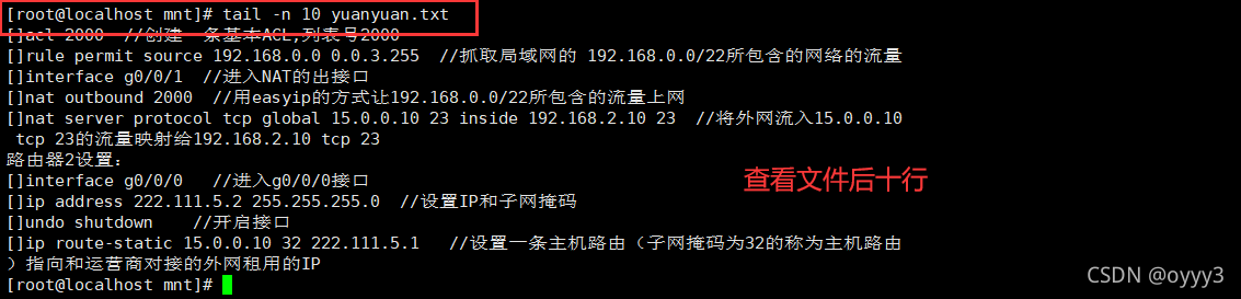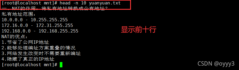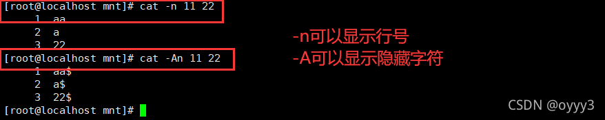 选项 | 作用 | -n? | 显示行号,包括空白行 | -b | 跳过空白行,显示行号 | -s | 将多个空行压缩成一个空行 | -A | 显示看不见的字符即隐藏字符 |