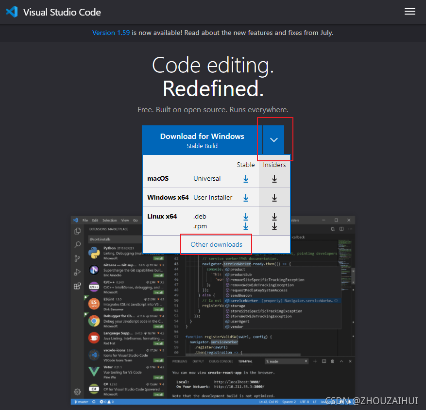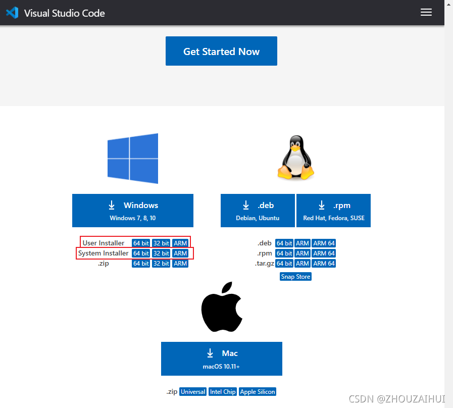 下载地址:https://code.visualstudio.com/   Windows系统下VSCode有两种版本安装程序:User Installer和System Installer,区别在于User Installer版本权限受限,System Installer版本没有权限限制,类似于以管理员权限运行。建议下载安装System Installer版本。