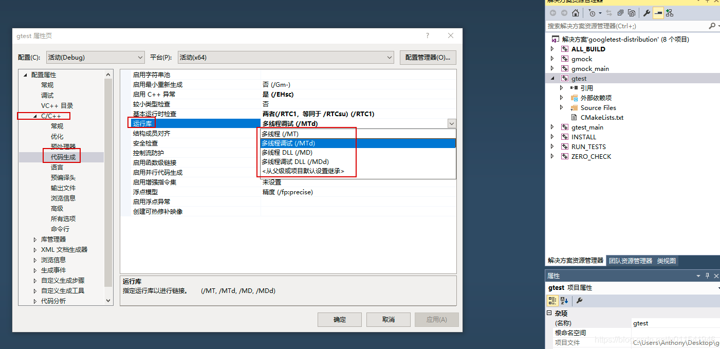 - 2. 生成Debug X64的解决方案。(1)将该工程下4个项目的工具栏和项目属性统一设置为Debug X64;(2)将该工程下4个项目的“配置属性 - C\C++ - 代码生成 - 运行库”设置为统一格式(例如:多线程DLL(/MDd),注意:以后使用gtest工具的项目都需要设置为此格式!!!);(3)生成解决方案,生成文件的路径为“D:\googletest-release-1.8.1\googletest\msvc\2010\gtest”。