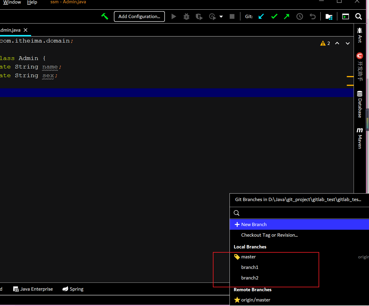 然后我们再切换到master主分支,进行分支的合并  这时候我们将分支1和分支2合并到了master分支,然后进行提交到git   上面显示推送成功,我们去gitlab看一下是否有变化,可以看到gitlab上也同步我们修改的代码了。  接下来我们使用IDEA模拟一个程序员对一个分支进行开发,我们前面已经将代码拉取下来了,所以我们只需要update一下,更新修改的内容。