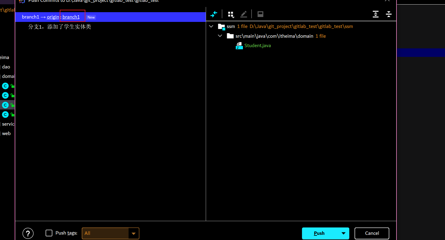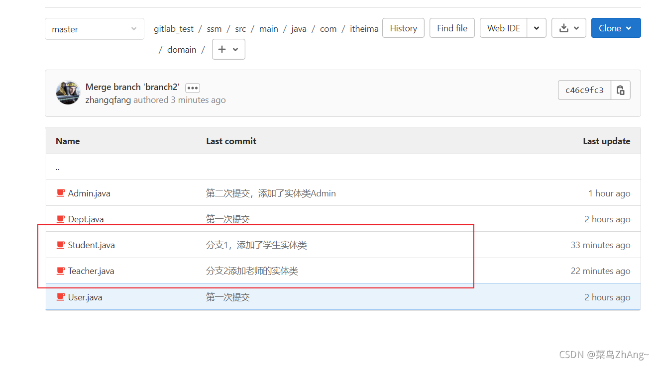 我们添加一个学生类,模拟修改代码,进行提交。可以看到我们提交到了分支1上面,而不是master分支。  去gitlab上查看是否成功提交  同步骤切换分支2提交代码