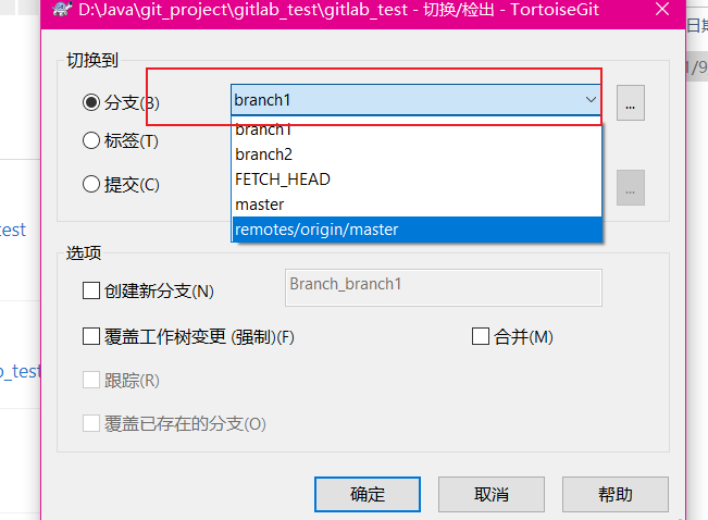 点击右下角的分支管理,这时候我们发现项目多了两个分支  假如此时我们分配到的是在分支1上面开发,我们checkout到分支1
