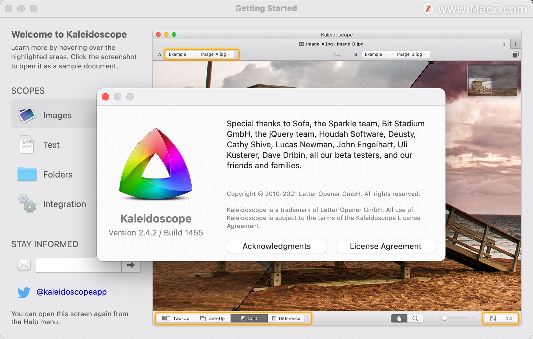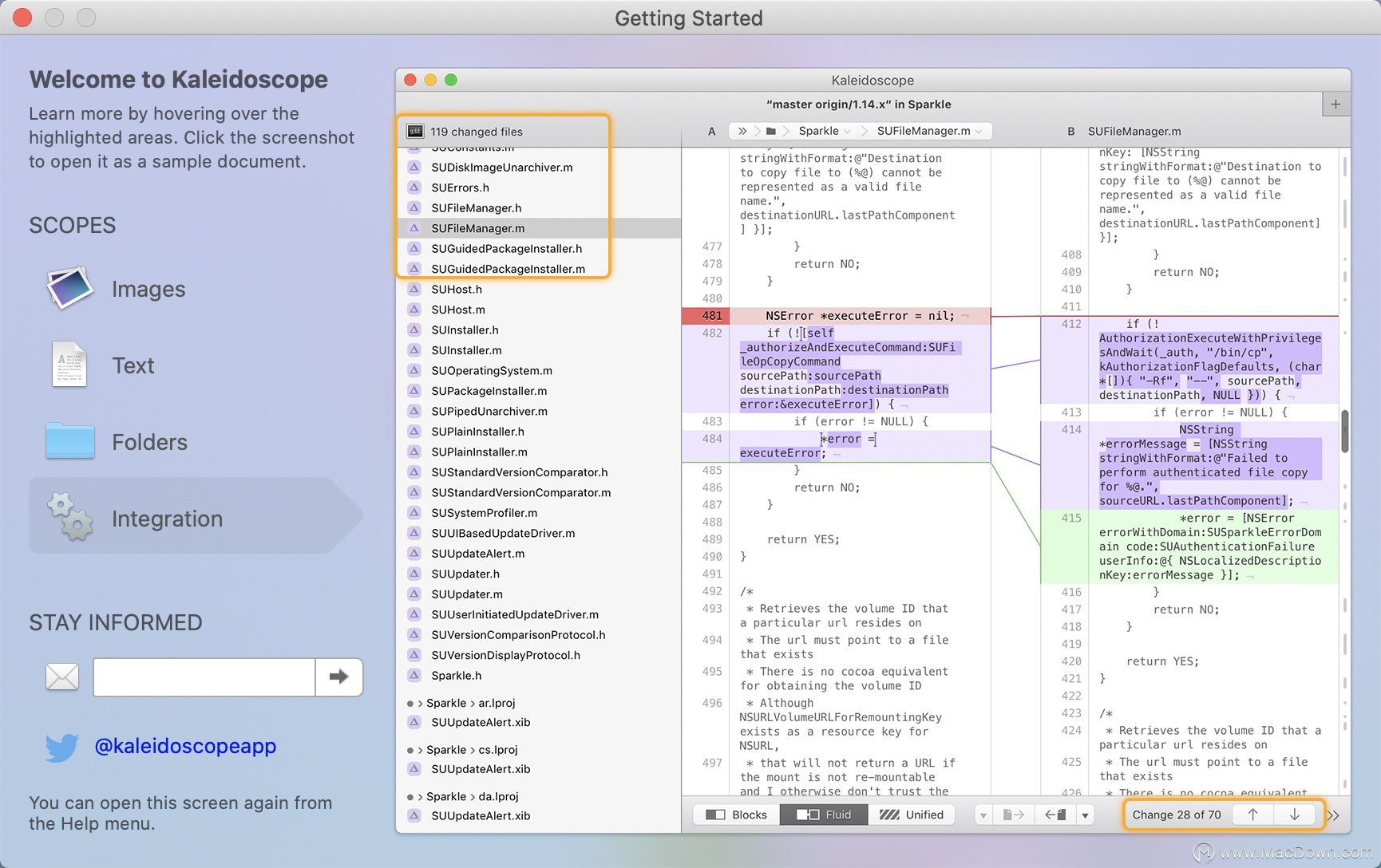 Kaleidoscope Mac版是Mac OS平台上一款很强大的文件和图像比较工具,支持任何文本文件和 jpeg、tiff、png、psd 等格式的图像文件,同时和 git、svn 等版本控制工具能够完美的结合,在几秒钟内就可以查找回顾以及合并更改,能够非常快速和准确的查找出不同之处和合并不同的文档或图片。
