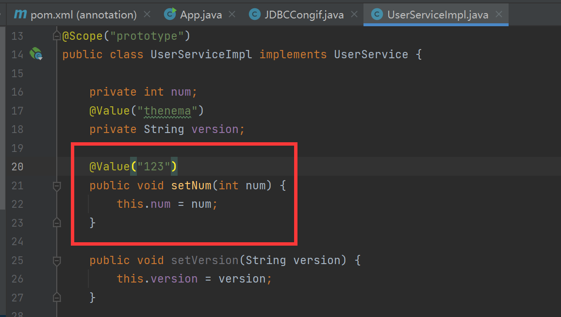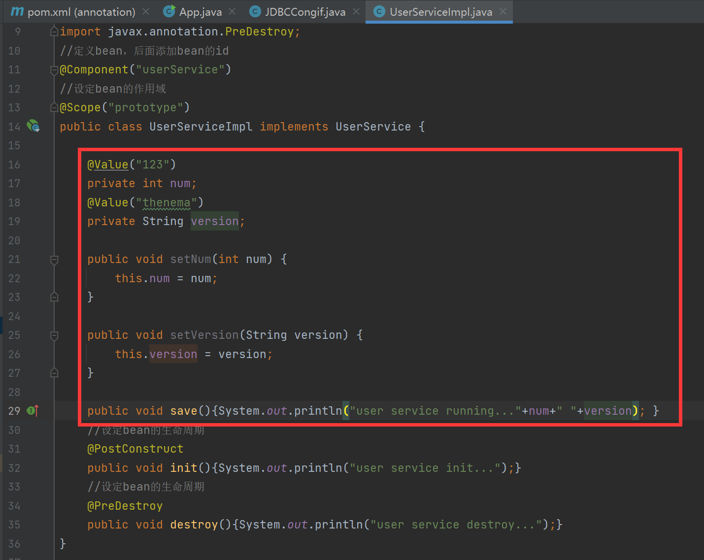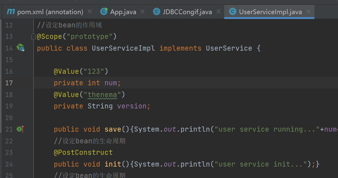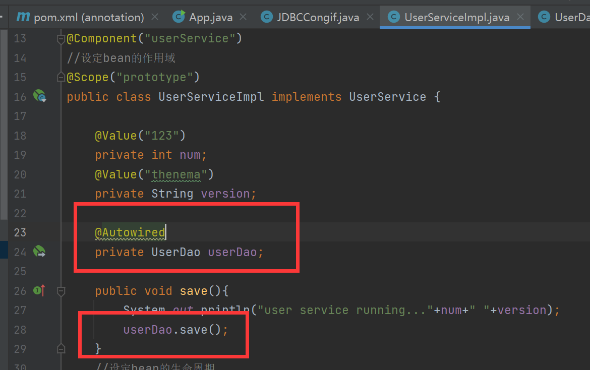 在UserService里添加  运行结果可见  还可以将其放到set方法上面  也能删掉set方法!