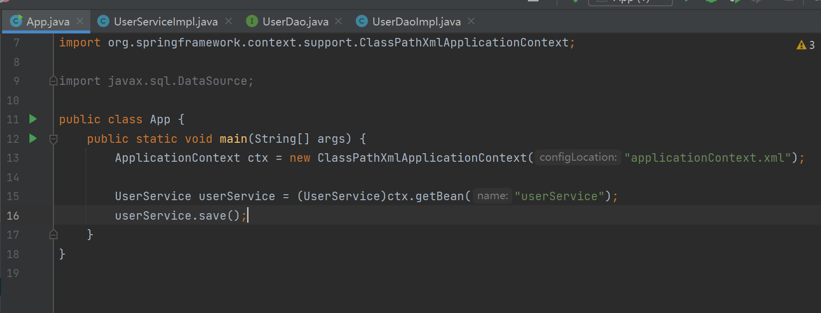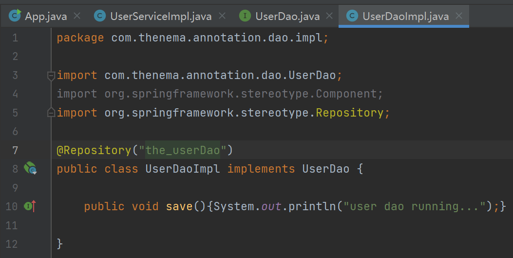 @Autowired自动装配,此时只有UserDaoImpl一个userDao类型的实现类,所以自动装填这个实现类。只支持接口只有一个实现类的时候  可以用@Repository给实现类定义个id,支持一个接口有多个实现类的情况