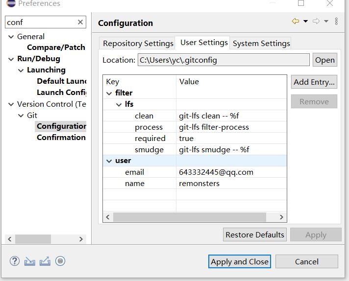 ? 依次点击window -> preferences ->在搜索框中搜索Configuration,点击User Settings,右边的Add Entry...