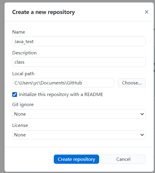 注册Githus账号,下载客户端,进入之后点击File->Create a new repository,填写信息,完成创建。(记下Local path)