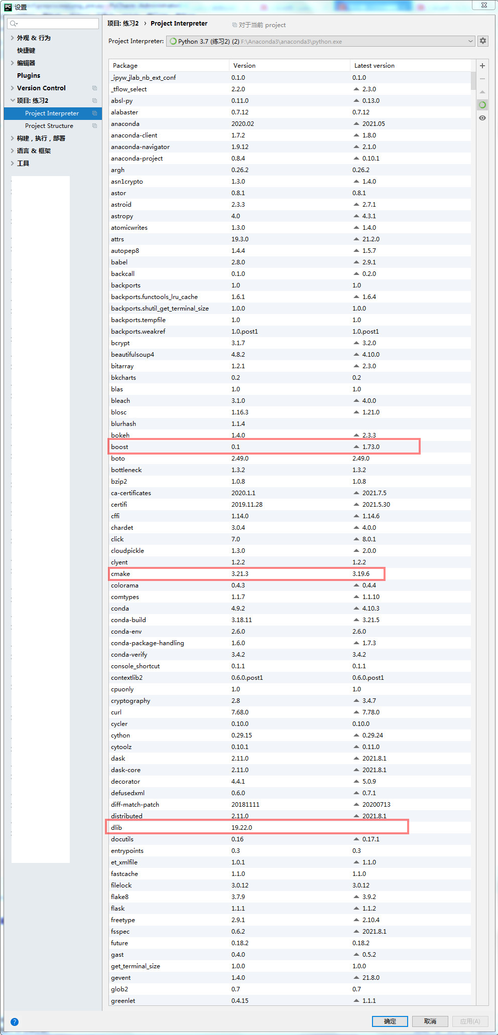 ??之前安装python时重复安装了,所以有多个版本,直接查询python版本是3.8,而anaconda中配置的是python3.7,所以要格外注意dlib与python版本的匹配。