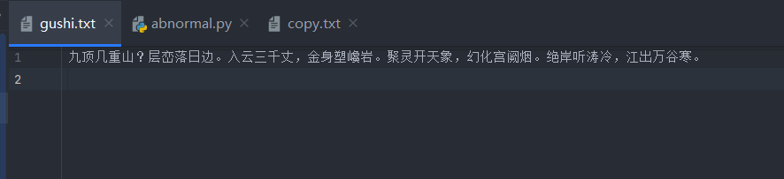 contents = '''九顶几重山?层峦落日边。入云三千丈,金身塑巉岩。聚灵开天象,幻化宫阙烟。绝岸听涛冷,江出万谷寒。'''