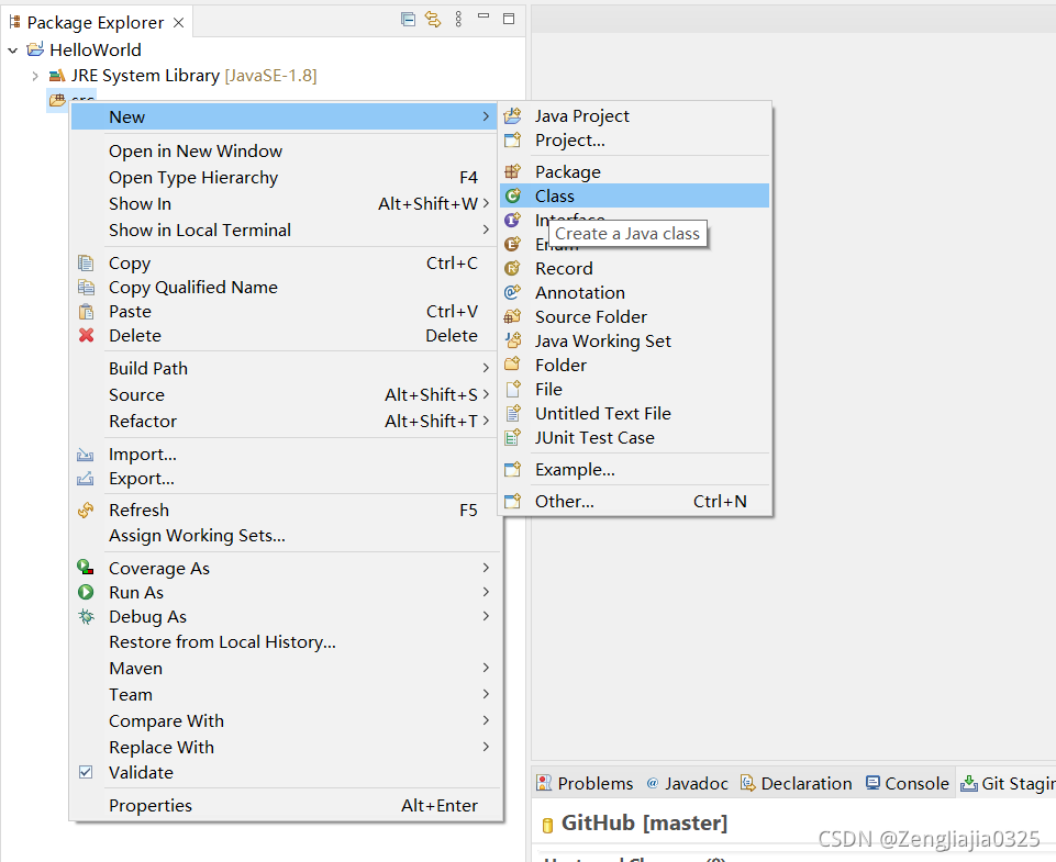 - ?在Package Explorer中右键src,依次点击 New? -->? Class?