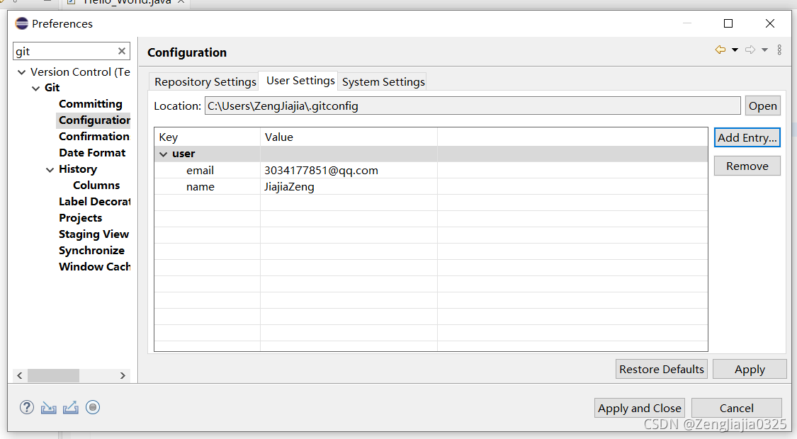 - 上方菜单栏点击? window? -->? preferences? ,然后再输入框中输入Git,点击?Configuration? -->??Add Entry...? ,添加? user.email? 和? user.name? ,最后点击? Apply and Close