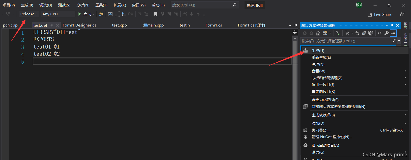 先将解决方案切换到Release模式,再在CreateDLL项目名称上右击选择【生成】或【重新生成】