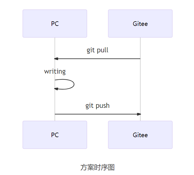 具体到使用场景,每次我们准备要进行文档工作时,需要手动使用 Git 工具,将存储在 Gitee 的文档仓库与本地仓库同步,之后再进行我们的日常工。当工作完成的差不多时,使用 git commit和push命令,将我们所作的改动再同步到 Gitee。如此一来就完成了代码的同步,整个过程和使用版本控制工具进行代码研发时的操作如初一折,只是省略的分支管理的概念,所有的文档操作全部同步到 master 分支即可。方案具体的时序图如下: