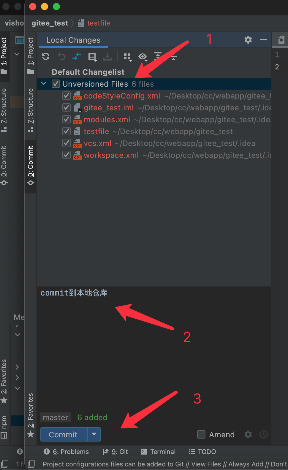 commit到本地仓库 2.1 可以在VCS里点击  2.2 也可以在工具栏点击  2.3 选择文件,填写更新信息,并commit  2.4 完成commit到本地仓库  -