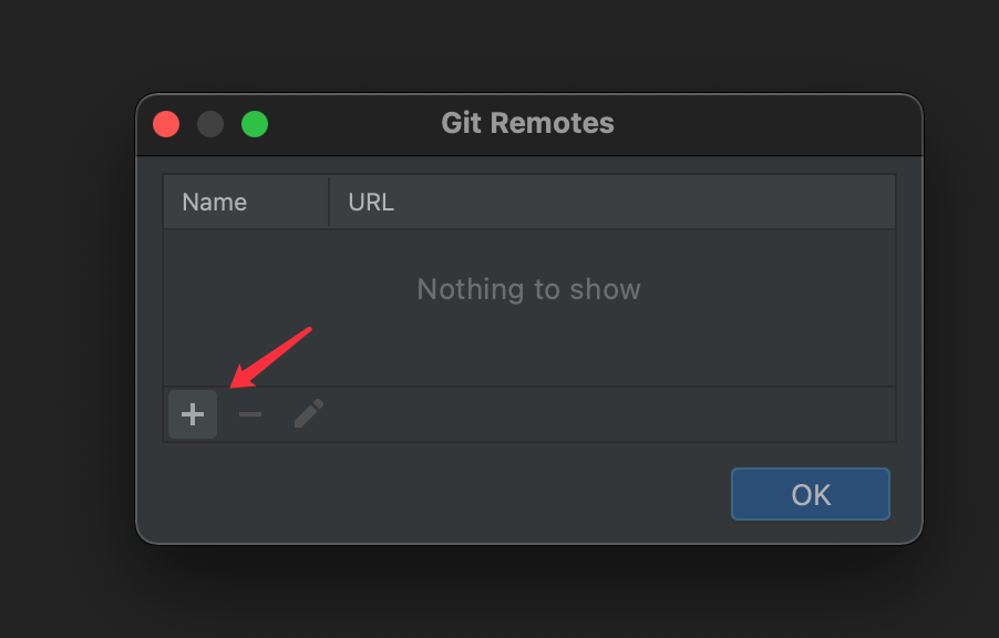 连接远程仓库 6.1 在VCS中现在有git选项了,点击remotes  6.2 点击加号  6.3 将刚才复制的连接粘贴进去  6.4 如果是第一次使用,需要输入用户名和密码 -