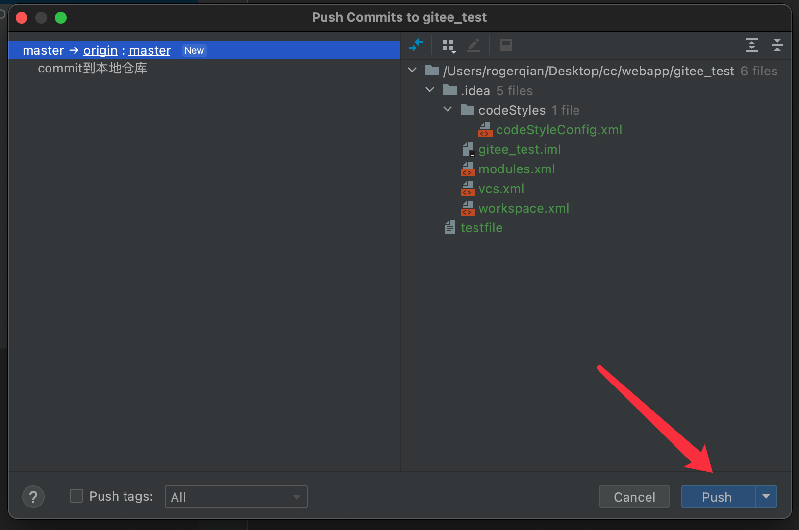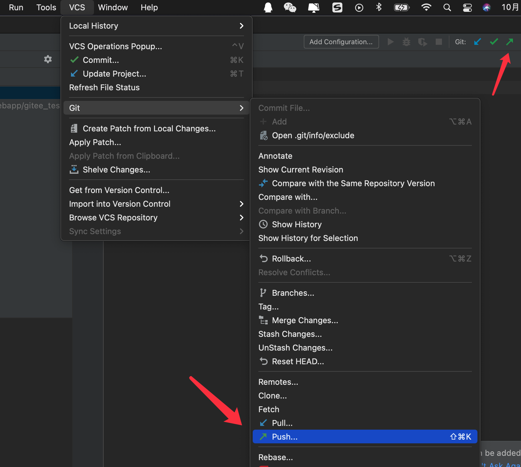 push到远程仓库 3.1 在VCS或工具栏点击push  3.2 push  3.3 成功  -